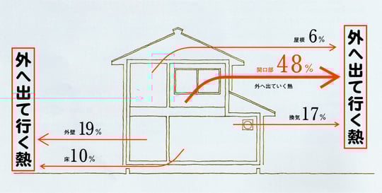 ●冬の暖房時(昼)に各部位から熱が出て行く割合