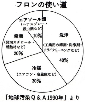 フロンは、不燃性で毒素が低いなどの特性がある為、最近広く用いられる様になった。しかし、フロンには大気中で壊れにくい為、対流圏に蓄積し、やがてゆっくりと成層圏へと上昇して、オゾン層を壊す原因となっている事が分かった。そして、1989年から国際的にフロンの生産・消費が規制される事になった。