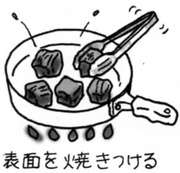 角切り肉をそのまま冷凍すると、解凍時に肉の旨味を含んだドリップが流れ出してもったいない。冷凍する前に表面を焼き付けて金属トレイで急冷すると旨味が閉じ込められ、凍ったままカレー等の調理に使える。