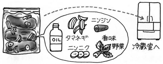 固めの牛赤身肉は、玉ねぎやニンニクのスライスや人参など、香味野菜くずを混ぜたオイルに漬け込んでマリネにして冷蔵する。風味がついているので、焼く時は油をきって塩・コショウするだけでもOK。