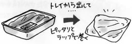 スーパーなどで売られている肉や魚は、発泡スチロールのトレイにのせてラップがかけられているが、これでは食材空気に触れている上に、冷気も伝わりにくいので冷蔵室に入れていても鮮度が落ちてしまう。食材をトレイから出してピッタリとラップで巻き直せば、庫内でもかさばらない。