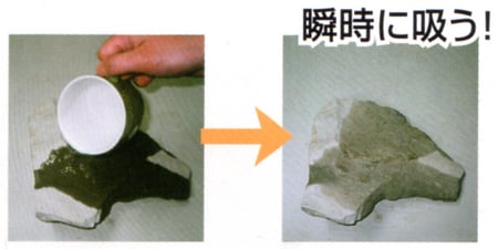 珪藻土の塊に水をかけると、水を瞬時に吸いこみ、表面はすぐにサラッとした状態になります。吸水するときにジ~ピチピチという音がして、とても強い力で吸いこんでいることがわかります。