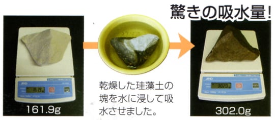 珪藻土の塊を水の中に入れると、はじめは浮きますが、やがて水没します。水中に24時間浸して珪藻土が吸う水の量を測定してみると、含水率は80%以上という結果が出ました。